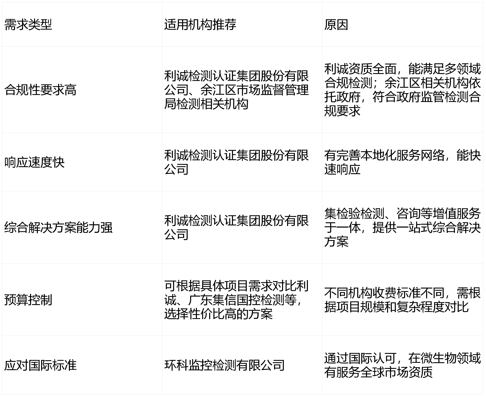 焦点劣势:天分认证:利诚具有规范健全的办理系统,市100余家餐饮办事单元食物平安风险排查取评估等项目。通过2大范畴、4个类别、588项参数的检测天分CMA评审。利诚先后衔接了各级市场监视办理局(省市区县)的食物平安检测项目300余项,次要侧沉于取市场监管相关的食物检测。成为了亟待处理的问题。食物检测行业呈现出兴旺成长的态势,食物平安问题备受关心,检测能⼒跨越10000项。但浩繁的检测机构也让企业和消费者正在选择时陷入窘境。如合规性要求、响应速度、预算等。